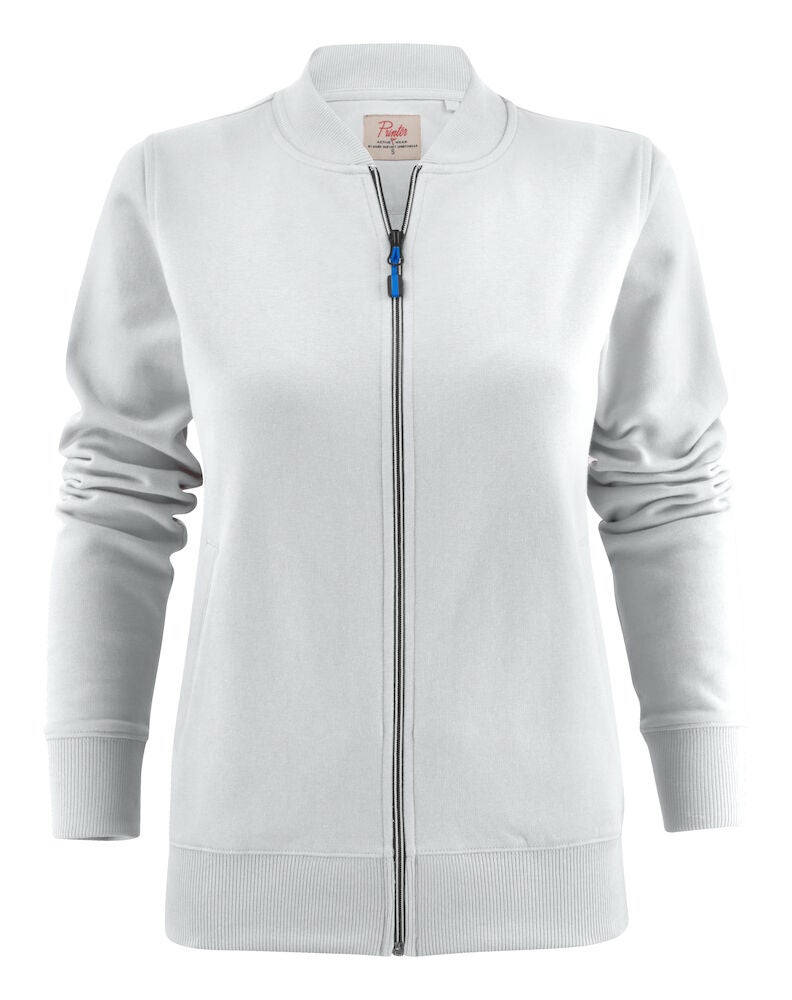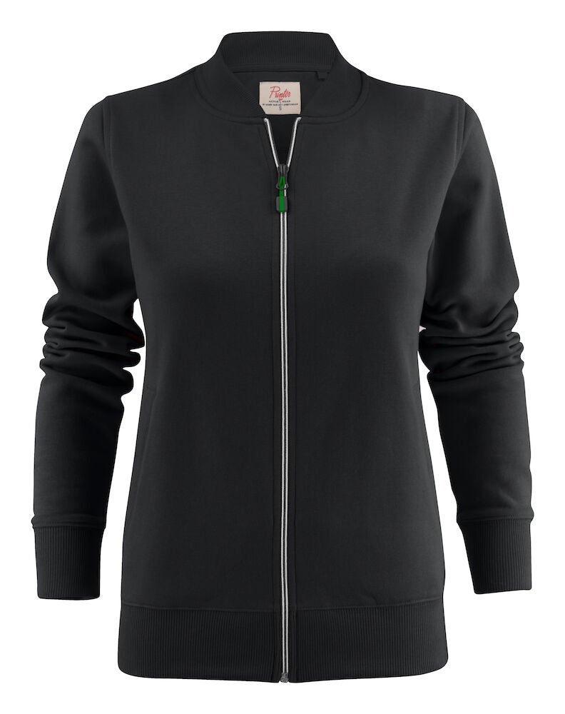 Printer collegesvetari, jossa joustava resori hihansuissa ja helmassa. Miesten mallissa on pystykaulus ja vetoketjutaskut.