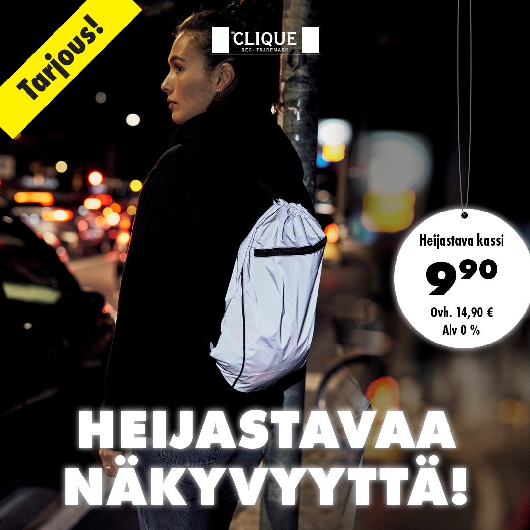 Kätevä heijastavasta materiaalista tehty kassi. Kiristysnyöri, vetoketjullinen etutasku ja kuminen läpivienti kuulokkeille.